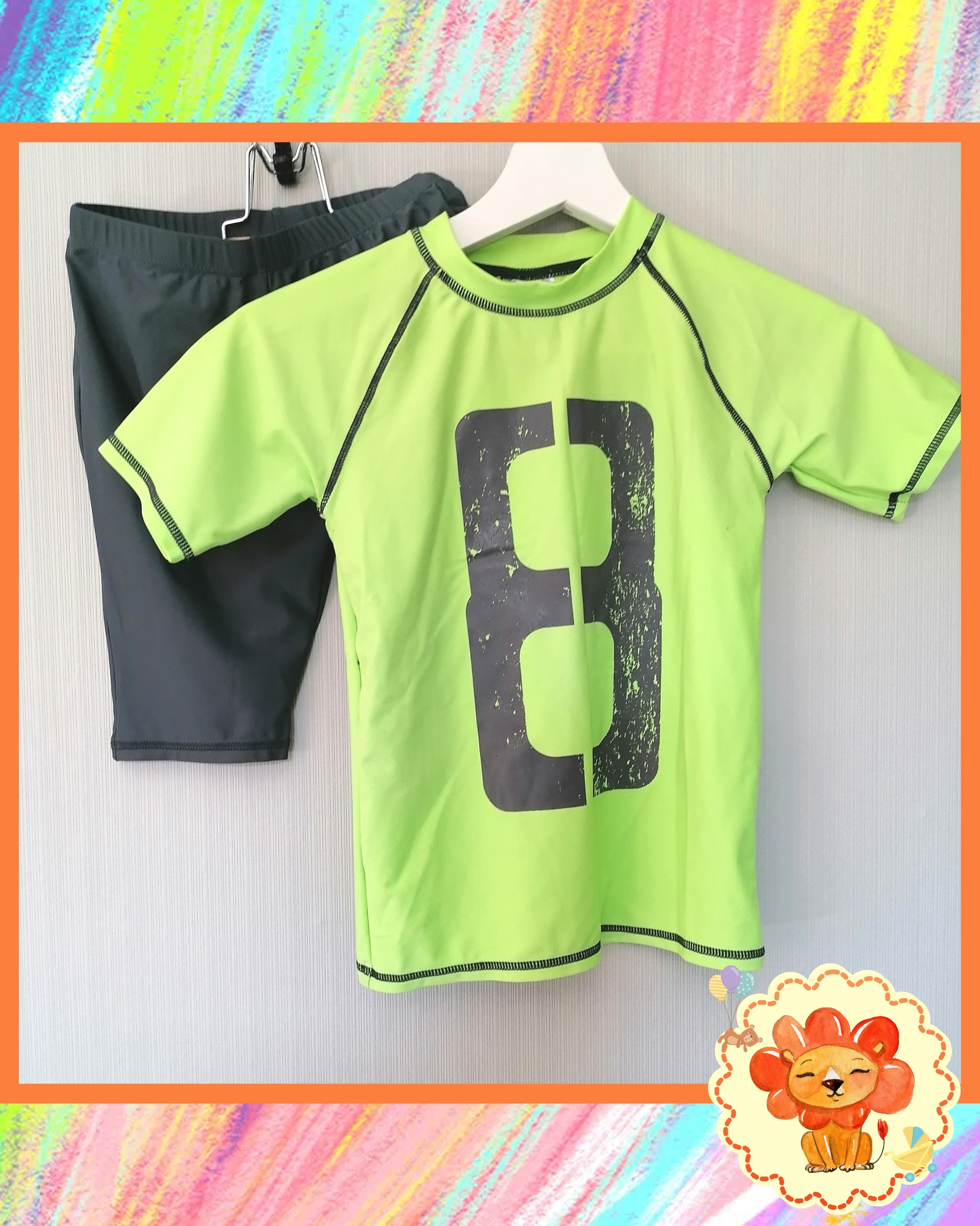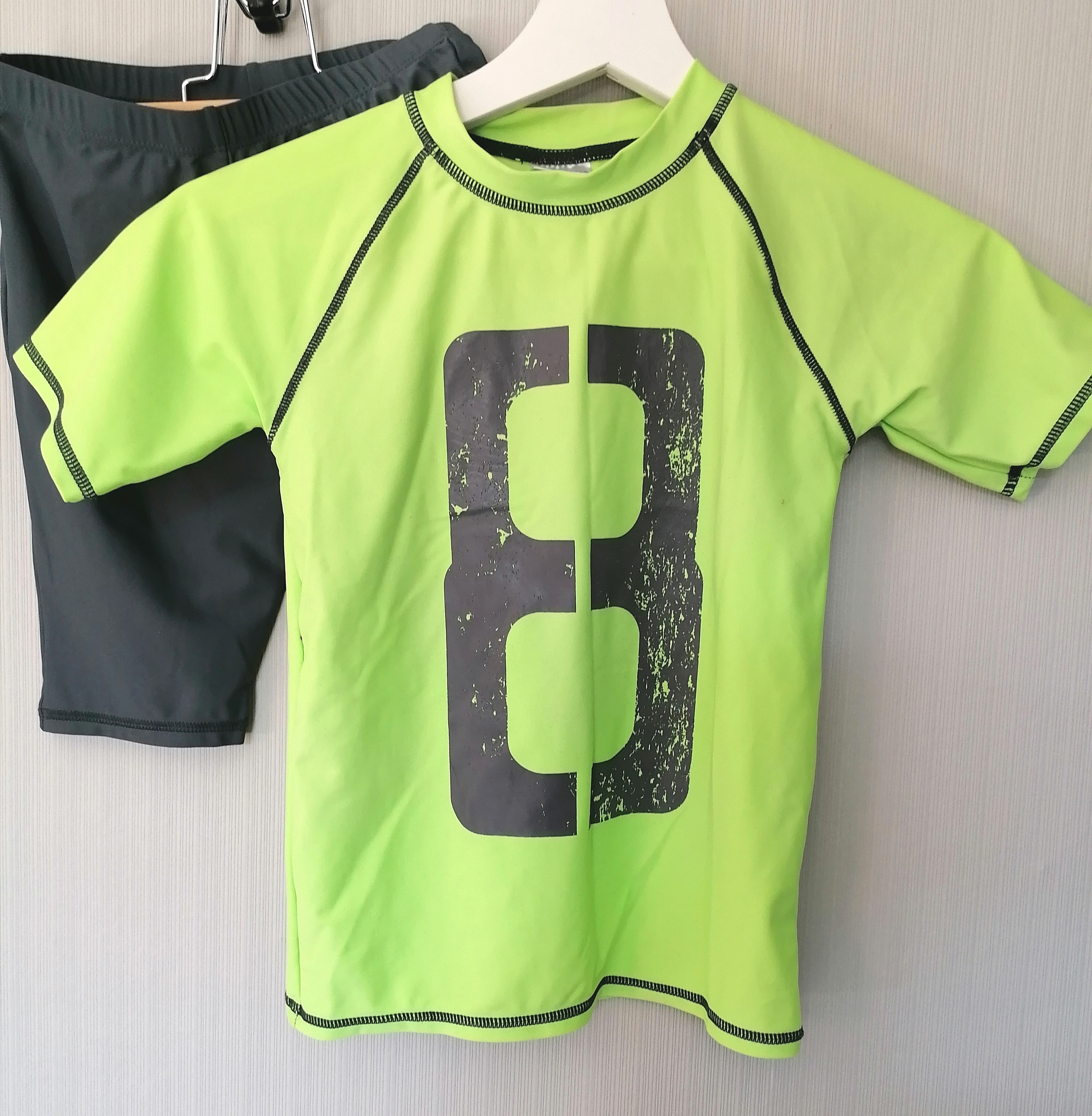 Ein 2 teiliges Badeanzug : Badeshirt und Badeshorts von Pocopiano in der Größe 110-116. Guter Zustand, nur der Aufkleber vorne hat sich aufgelöst.