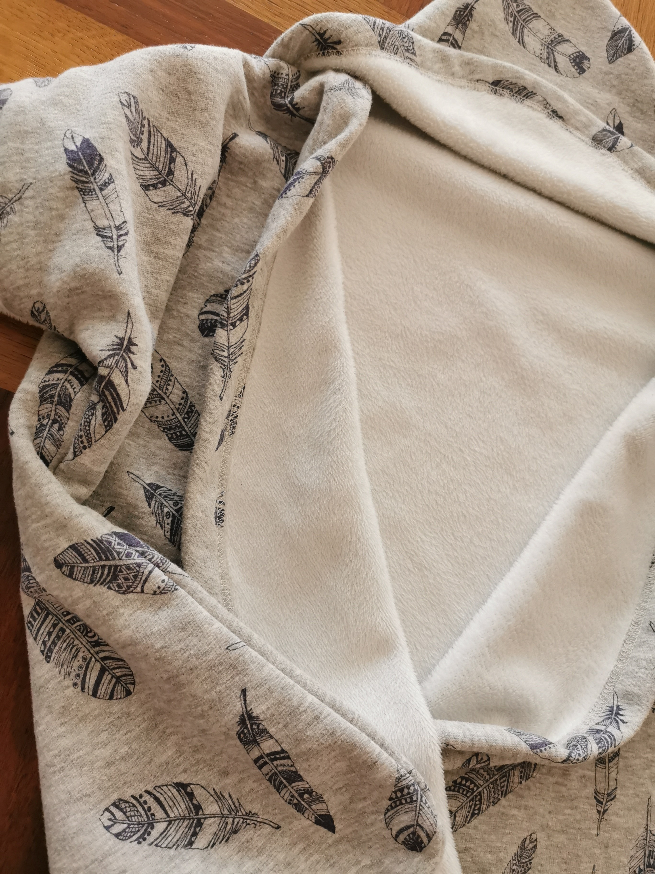 Dieser ist grau und hat violette Federn drauf. Innen ist er weiss. Er ist im guten Zustand, hat keine Löcher oder Flecken.